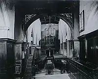Around 1670, the church was refurbished, a gallery was built at the western end of the nave, and the carved reredos and a large wooden Royal coat of arms, now at the west end of the nave, were acquired at the same time.[10] An inspection report at the end of the 18th century commented on the dirty transept walls, and the need to install the equivalent of a cattle grid to keep pigs out of the churchyard. Rich crimson hangings in the church had earlier attracted the attention of a thief.[11] The increasing congregation led to the replacement of the pews and the construction of galleries down both sides of the building in 1829,[10] but a more extensive rebuilding was undertaken in 1878–80, by James Piers St Aubyn. The galleries were removed and the two outer aisles were added during this period, a chapel was converted to a vestry and improvements were made to the Hastings Chapel. The cost of these works has been estimated as between £16,000 and more than £18,000[6][10] (equivalent to £1,906,300 in 2021).[12] Later developments included the expenditure of £13,000 (equivalent to £239,900 in 2021)[12] between 1963 and 1968 to combat deathwatch beetles found during rewiring, improvements to the heating system, and a rededication in 1974, the quincentenary of the church.[10]