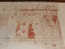 In the 1870s, Charles Eddy, vicar of the church, uncovered a large number of wall paintings and painted scriptural texts dating to the 13th through 16th centuries which had been whitewashed over in 1550–1551 during the Reformation.[6] The earliest paintings are on the south wall, and depict a series of martyrdoms, the best preserved being a depiction of the murder of Thomas Becket by four knights in 1170. On the north wall is 16th-century depiction of St Christopher which bears a remarkable likeness to contemporary portraits of King Henry VIII. The north wall also has paintings of scriptural texts (John 3:5, Psalm 26 verse 6, and Psalm 95), as well as two consecration crosses. There are also elaborate decorative painted designs in the chancel, around the north and south windows, and on the east wall, with paintings of saints on either side of the east window.[7]