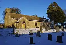 In the churchyard is a medieval sandstone cross base.[6] It is roughly octagonal in shape with a diameter of about 3 feet (0.9 m), and is about 2 feet (0.6 m) high.[1] The cross base is listed at Grade II.[6]