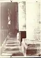 While the external fabric of the church is largely Early English in style due to the Victorian restorations, much of the interior consists of Norman material.[12] This is present in the nave, the crossing, the first bay of the chancel, the arch to the Lady Chapel and in the remains of the choir chapels.[14] Richards considers that it is the best masonry of the Norman period in Cheshire.[1] Inside the church are many early effigies which are all damaged, some dating back as far as the late 13th or early 14th century.[1][2] Monuments to the Warburton family are in the Lady Chapel. In the church are two fonts, one dating from the 15th century, the other from the Commonwealth period. Two brass chandeliers are dated 1722.[1] The pulpit is from the 19th century. The reredos, dated 1876, is by John Douglas and was made by Morris & Co.; it includes a painting of the Last Supper.[2] The organ had been built as a temporary organ for the coronation of Queen Victoria in 1838 by William Hill and Company of London. It was then rebuilt for St John's, transported to Chester by barge and installed at the west end of the church. It was opened on 28 October 1838 with the opening recital given by Henry Gauntlett as he could actually play the pedals. In the 1859–66 restoration it was moved to the south transept and in 1895–96 it was moved to the north transept, when the organ was put in its current case. In the 1960s it was converted to electro-pneumatic action by Charles Whiteley and Company. In 2002 it was restored by Rod Billingsley following vandalism.[15] The organ case dated 1895 is by Thomas M. Lockwood. A memorial to Lockwood is in the north aisle. The stained glass in the east window dated 1863 was designed by T. M. Penson and made by Clayton and Bell. The west window was designed by Edward Frampton and is dated 1887–1890. In the north aisle is a barely visible wall painting of St John the Baptist.[14] The church contains nine memorial boards by members of the Randle Holme family.[16] Also inside the church are fragments of late Saxon stone crosses that are thought to have been originally in the churchyard.[17] The parish registers begin in 1559.[1]