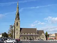 The church is a major work of Charles Hansom,[2][3] built in 1849–50 in Victorian decorated style together with the presbytery; the steeple was added to the west tower in 1868. The nave has north and south aisles with a clerestory; at the east end there is a vestry on the south side and a Lady chapel, formerly used by the sisters of St Anthony's convent, on the north side. The approximately 75-foot (23 m) tower has diagonal buttresses, a stair turret with a pinnacle, and a trefoil balustrade with small pinnacles; the octagonal spire surmounting it has lucarnes and flying buttresses.[1][4]