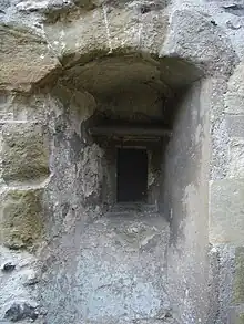 One unusual[2][4] and ancient feature of the church, which survived in a complete form until the 14th century,[1] was an anchorite's cell. These rare features, associated with medieval churches, housed hermits who were pursuing a life of asceticism: they would be walled up inside the cell for life, and a window into the chancel would connect them to the church.[2] At St Julian's Church, the cell walls themselves were removed by the 14th century, but the window (a form of hagioscope) and a door remain in perfect condition,[2] and the roofline can still be seen.[4] The door would have been built over when the anchorite was in the cell.