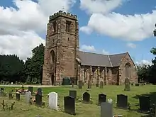A Saxon chapel was originally on the site.[1] It was not mentioned in the Domesday Book but fragments of architecture still present in the 19th century showed that a new church must have been built soon after the Norman conquest. Ormerod quotes sources from the 14th century which stated that at that time the church was "a sumptuous fabric of stone and wood, of great size, with four bells, but was then becoming ruinous".[3] The present church dates from its rebuilding in 1827, undertaken by George Edgecombe (or Edgecumbe), and very little of the original work remains. A further restoration was carried out in 1911–12.[4]