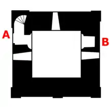 Simplified ground floor plan: A – entrance and spiral staircase; B – original entrance, blocked