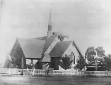 In 1860, Glennie was appointed Rector of Warwick.[1] It was during Glennie's time in Warwick that the decision was made to construct a more permanent church building. The architect chosen for the building was Brisbane-based Richard George Suter.[1] John McCulloch was the contractor of this early section of the present building with the stone being quarried from Bishop of Brisbane Edward Tuffnell's Sidling Quarries. The foundation stone of the present sandstone church was laid by Tuffnell on 19 March 1868.[4] The original building consisted of a short nave, transepts, chancel and a small octagonal vestry in the corner of the chancel and southern transept. A broach spire surmounted the intersection of the nave of the church and the transepts and the roof was of timber shingles.[1] The original timber church was retained as a parish hall until it was demolished in 1910.[5]