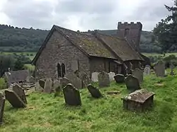 The church is constructed of Old Red Sandstone rubble with stone-tiled roofs.[1] The architectural style is Gothic and the building comprises a nave, chancel, porch and a three-storeyed tower with a castellated parapet.[1] The interior is slightly less altered than the exterior, the nave roof dating from the late 13th or early 14th centuries.[3] The unevenness of the structure remains very evident, however, the writer Simon Jenkins noting, "visitors might be on the deck of a galleon in a storm, with the chancel about to slide overboard".[7] The Monmouthshire writer and artist Fred Hando describes the church chancel as an example of a "weeping chancel", where the non-alignment of the nave and chancel axes was deliberate and was intended to represent the body of Christ in death, the nave standing for the body and the chancel standing for the head, fallen to the right.[8] The rood screen is a "remarkable work of craftsmanship".[7] The church's windows are 16th-century and the communion rails date to the 17th century.[3] A number of 18th- and 19th-century funeral monuments within the church were constructed by three generations of the Brute family of the distant village of Llanbedr, near Crickhowell, Powys.[3]