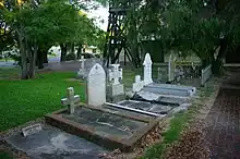 Most of the graves are marked with a marble headstone about one metre (3 ft 3 in) high. Many also have either a wrought iron grave surround, or a flat stone slab covering. The graveyard also features a modern low wall on which memorial plaques are displayed.[1]