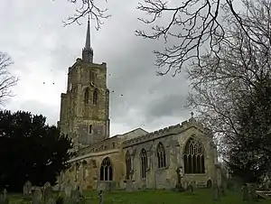 The church dates almost entirely from the 14th century and is renowned for its ornate tower which stands at 176 feet (54 m) and which is crowned by an octagonal lantern with a leaded flèche or spire. The church also contains some medieval graffiti carved on its walls which highlights the plight of survivors of the bubonic plague pandemic known as the Black Death. The church has been Grade I listed since 1968.[4]