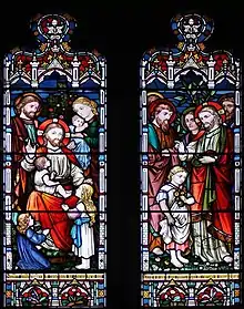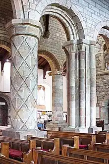 The west part of the arcade between the nave and the inner north aisle is early Norman with round arches; some of its piers have incised decoration similar to that on the piers in Durham Cathedral.[2][3] The south arcade is later and simpler. To the east ends of the arcades, the arches are pointed. The easternmost pier of the south arcade contains a piscina. The outer north arcade is in Perpendicular style. The pulpit is dated 1619, but has been reduced in size since. The font has been moved from a 14th-century chapel at Killington and is set on a 19th-century base. The reredos is in alabaster with mosaic decoration. Most of the stained glass is by Lavers, Barraud and Westlake, but there are also windows by Heaton, Butler and Bayne (designed by Henry Holiday), by Shrigley and Hunt and by William Wailes. The oldest monument is a tomb chest with an alabaster effigy dating from the 15th century.[3] The two-manual pipe organ was built in the 1860s by Forster and Andrews and rebuilt and enlarged in 1925 by Jardine and Company.[6] It was extensively rebuilt in 1972 by Laycock and Bannister.[7] There is a ring of six bells, all cast in 1825 by Thomas Mears II of the Whitechapel Bell Foundry.[8]