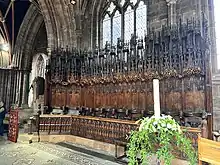 The ceiling of the chancel consists of a stone lierne vault with almost 70 carved bosses dating from the 14th century. The eastern bosses depict the life of Mary and the western ones Christ's Passion and Resurrection. Over each choirstall is a carved wooden triple-arched canopy.[20] The canopies are described as having "a complexity unsurpassed in English medieval woodcarving".[20] Clifton-Taylor considered that they are the finest in the country, although he complained that they have been stained nearly black.[21] At the lower ends of the canopies are Victorian carvings of angels, grotesques and foliage and below these are carvings on corbels of subjects such as mermaids, centaurs, wyverns and musical angels. At the back of the choir stalls are 20 misericords which date from the early–mid 15th century. Under of each of these is a different carving; the subjects include Saint George and the Dragon, the Virgin and a unicorn, and a pelican with her brood. At the ends of the choir stalls are carvings of poppyheads, wyverns and a green man.[20]