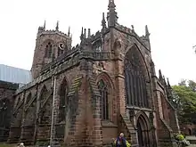 The first building on the site was a chapel of ease in the parish of Acton. In about 1130 both Acton church and Nantwich chapel came under control of the Cistercian abbey of Combermere.[7] The building of the present church started in about 1340 in the Decorated style, which was the style most commonly used in English church building at that time. The masons, who came from Yorkshire, used local sandstone, probably from Eddisbury near Delamere. Building work was interrupted between 1349 and 1369, probably due to an outbreak of the Black Death plague. By the 1380s the town's prosperity had recovered and building work resumed. This phase of construction was carried out by master masons associated with Lichfield and Gloucester cathedrals, now building in the Perpendicular style.[8] The south transept was endowed as a chantry chapel in 1405.[4] In the late-15th or early-16th century, the south porch was added, the nave roof was raised and the clerestory windows were added. Following the dissolution of the monasteries, six chantry chapels were removed in 1548. Between 1572 and 1577 the transept ceilings were renewed, and between 1615 and 1633 the church floor was raised because of flooding, a west gallery was built, and the walls were painted white, with the addition of scriptural texts.[8] The church was briefly used as a prison for Royalists captured at the battles of Nantwich and Preston during the English Civil War.