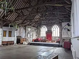 The north aisle is divided from the nave by a large timber arcade. This replaced the arcade destroyed by the collapse of the tower, and the polygonal timber posts stand on the 14th-century bases of the earlier arcade. The octagonal font is dated 1662, and its bowl is carved with quatrefoils. The 18th-century pulpit is polygonal, standing on a 19th-century base, and was formally part of a three-decker pulpit. The altarpiece is large and consists of a broken pediment on fluted pilasters. It was installed in 1756, and formerly held panels containing the Ten Commandments and the Creed that are now hanging on the north wall. Also on the wall of the church are the Royal Arms of Charles II dated 1660. In the aisle are 18th-century benches moved from Gopsall Hall in 1956. The altar in the aisle was formerly in St Mildred's Church, Canterbury, and the main altar dates from 1956. From the medieval period are niches, an aumbry, and floor tiles. In the north wall is a late-14th-century tomb recess. The memorials include a wall tablet dated 1606, and a wall monument dated 1808 by Westmacott. The stained glass dates from the 19th and 20th centuries. It includes 19th-century windows by Ward and Hughes, and windows in the north aisle dated 1933 by Morris & Co.[1]