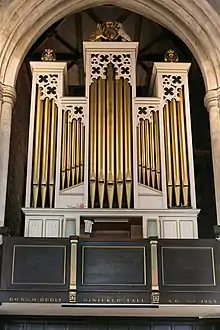 The basis of the current instrument is a pipe organ which was built by Father Henry Willis for the Great Exhibition in 1851 and installed and opened by him in Totnes on Sunday 11 August 1861.[7] It has since had subsequent restorations and modifications and now comprises 3 manuals and pedals with 33 speaking stops. A specification of the organ can be found in the National Pipe Organ Register.[8]