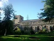The church is constructed in sandstone and limestone rubble with red sandstone dressings and slate roofs. Its plan consists of seven-bay nave with a clerestory, north and south aisles, a south porch, a chancel, and a west tower. The tower, dating from the 16th century, is in three stages, with buttresses at the angles, and an embattled parapet. It contains a west doorway, above which is a three-light window containing Perpendicular-style tracery. The bell openings have three lights, are louvred and have hoodmoulds. The north wall of the nave contains pointed windows with Perpendicular tracery, all with two lights, other than the western window, which has three lights. The west window has five lights. The windows in the clerestory have flat heads and three lights, and are mullioned. The south wall contains a priest's door, with four windows to its left and two to the right; all have two lights. The porch is gabled and has a cross finial. The east window in the chancel has five lights.[2] The inner doorway dates from the 12th century, it is in Norman style, and has zigzag decoration. Hyde and Pevsner in the Buildings of England series state that it is neither complete, nor is it in its original position.[7]