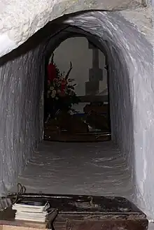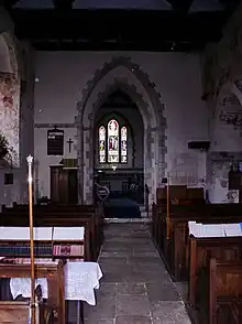 The church consists of nave, chancel and a south aisle separated from the nave by a three-bay arcade. The chancel arch is in the form of two arches, one inside the other, designed to accommodate the 5-foot (1.5 m) thick east wall, which supports the belfry.[8] The pointed arches of the south arcade are supported by round piers with varying capitals. In the angle of the chancel and south aisle there is an early thirteenth-century chapel.[8] Two round-headed Norman windows remain; the west window of the south aisle and the centre window in the north window of the chancel.[5][8] The chancel east window has the only stained glass in the church.[5] The "fantastically long"[4] hagioscope, about 9 feet (2.7 m) in length and resembling a tunnel, runs from the south aisle into the chancel through one of the pillars of the arcade and the chancel arch. These architectural features allowed worshippers in the aisle to see the bread and wine being consecrated during the Celebration of the Eucharist.[6] The church is roofed with Horsham slabs, a common material in churches in the area.[5] The oak shingled spire of 1602 rests partly on the masonry of the old belfry, or bell turret, and partly on the east wall of the nave.[5][8]