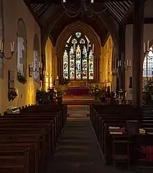 The church possesses a 15th-century stone reredos, purportedly from Troyes; above are five scenes of the Passion of Christ, and below is the Last Supper and Adoration of the Kings; the lower two occupy the same length as the Passion scenes above. The base to a 15th-century rood screen is present. There are four misericords on the north side, as well as three on the south side; the latter are older, probably dating to the early 14th century. The chancel's south window contains early 14th century grisaille glass in the head. The east window contains stained glass dating to 1919, depicting multiple brightly coloured scenes of the Passion.[4][2][5]