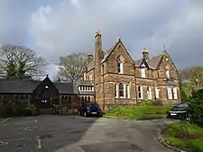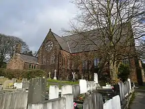 The school was built in 1869, with its entrance in Mount Street. It is constructed in red sandstone with a slate roof. The school is in two storeys and has a nine-bay front, the central bay projecting forward under a gable. The windows in the ground floor have three lights under ogee heads; those in the upper floor have two lights under cusped heads. In the gable of the projecting wing is a rose window. The school is also listed at Grade II.[3][8] The school building is now used at the Parish Hall and the ground floor is a Nursery.