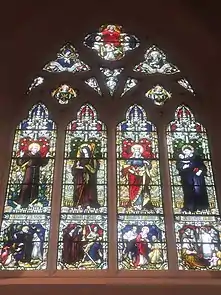 Inside the church, the high altar and reredos date from 1865, and were probably designed by E. W. Pugin. They were separated in 1948–50 by Weightman and Bullen, who placed the reredos against the east wall. The stained glass in the east window dates from 1878, and is a typical design by the Belgian stained glass painter Jean-Baptiste Capronnier.[3] The two-manual pipe organ was built by Franklin Lloyd in 1895, and is situated in a gallery on the north wall of the church at the west end.[6]