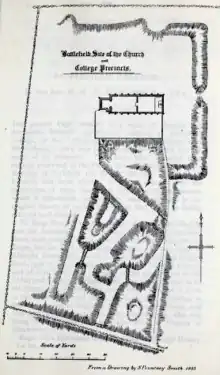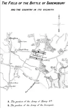 Sketch map of the Battle of Shrewsbury from Richard Brooke's Visits to Fields of Battle, in England, of the Fifteenth Century, 1857. The position of the church is represented between the insurgents' lines.
