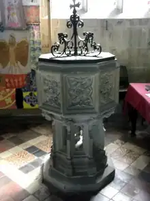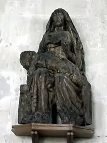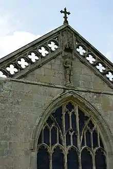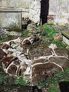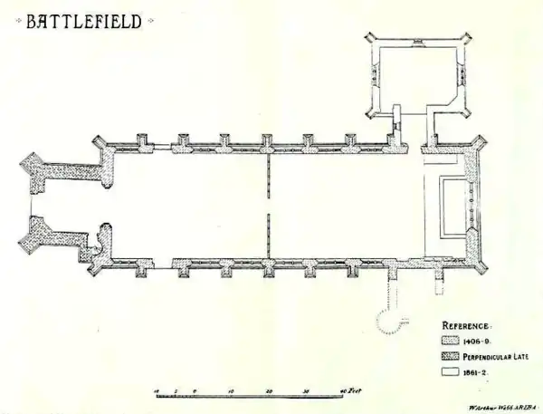 The chaplains at Battlefield initially had quarters in a three-story building next to the south side of the chancel and there are still visible remains of this.[41] Roger Philips acquired two parcels of land close to the south gate of the church and built three chambers on each to replace the old building. As he approached death in 1478 he settled these on the chaplains, on condition that they celebrate his anniversary on the Saturday after St Martin's Day (11 November) and pay 8d. annual rent to the Hussey family.[42] It is possible that a room in the church tower, which had a fireplace, also served as quarters for a resident priest.[43][44]