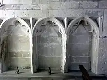 Sedilia, seats for officiating priest, deacon and sub-deacon on the south side of chancel