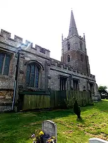 The church four-stage tower is of Gothic Decorated style below, and Perpendicular above. The lower early 14th-century three stages are of coursed ironstone with limestone ashlar cornerstone dressings; the top late 14th-century stage is entirely ashlar, as are the battlements, pinnacled at each corner, and the crocketed recessed octagonal spire. The spire is topped by a finial with weathercock, and at its lower part contains a single run of twin-light pointed arch lucarnes, these on each alternate face, each set-in gables with a globed device attached above. The tower is drained by one gargoyle centrally placed on each side below the battlements. Each corner is buttressed to the full height of the tower on the west side and from the nave and aisles upwards on the east. Clasping buttresses run to the top of the third (belfry) stage, and angled buttresses run over the fourth. The tower first stage contains one large pointed arch Decorated window, this on the west side, with no hood mould and plain glazed with twin lights (lancets) leading to trefoil heads. The central mullion runs to an oval rosette with quatrefoil insets, characteristic of c.1250-1310 Geometrical tracery. The second stage contains small and narrow single light windows on all but the east side. The third stage lies above the line of the nave, with the achievement of a single window on all sides. Each of these windows are of similar pattern to the bottom stage west window, but smaller, with transomseparating horizontal barand with an attached hood mould. The fourth stage windows are elongated versions of the third stage, but with added label stops at the spring of the hood mould. The tower sits on a simple moulded socle (plinth) topped by a cill bandangled projection that allows water to flow from a building facewhich continues around the whole church apart from the south aisle.[1][12][23]