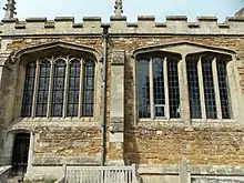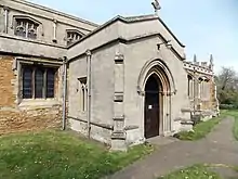Attached to the nave are the north and south aisles. The early 15th-century north aisle is of string-coursed ashlar, buttressed, with four windows of same appearance and stylerectilinear with inset three lights of simple round head, diamond-pattern leaded clear glazing, and flattened hood moulds. Three windows are placed on the north wall, the fourth serves as the aisle west window. Between the two north wall western windows is a simply moulded and slightly pointed door opening with hood mould and label stops, and a carved finial above. Within is a face-hinged oak door. The north aisle parapet is deeply crenellated to the same style as the tower battlements. Above the windows runs a moulding, defining the roof edge at the base of the parapet, holding two gargoyles which drain the aisle roof. Two double-stepped angle buttresses support the aisle on its north wall, with a third diagonal buttress at the north-west corner.[1][12]