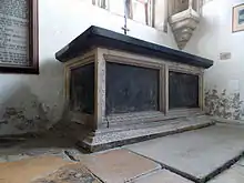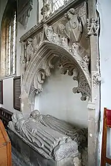 Within the north chapel, beneath the canopied niche on the north wall is an early 15th-century tomb memorial with two recumbent alabaster figures, attributed to Sir Richard Rickhill and his wife, Elizabeth.[1][12] Cox attributes the tomb differently, to William Rickhill, Justice of the Common Pleas, and his wife Elizabeth, c.1410.[13] Also in the north chapel is a table tomb with inlaid black marble panels, and a black marble lid with the inscription: "Sir Daniel De Ligne died the 20th day of March 1686 [and] The Lady Elizabeth his wife died the 25th of Aprill 1682", and heraldic shield above.[1][13] The Flemish De Ligne family purchased the manor of Harlaxton in the 17th century.[13]