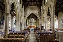 The current church mostly dates from the 13th and 14th centuries, and is built of stone from Clipsham, which is nearby. Most of the decoration of the church dates back to the rebuilding in the Edwardian period.[4] The tower dates to the 14th century. In the northern wall some 12th-century stonework can be seen, and at the eastern end of the church some stonework set into buttresses can be seen.[5]