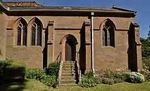 The church is built of local red sandstones. The main phases of building are Decorated Gothic, Perpendicular Gothic and a Gothic Revival Victorian restoration of 1864. It is a Grade I listed building.[1]