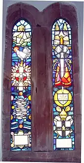 Apart from the east windows, the majority of the stained glass in the church dates from 1975 and was made by the artist Jane Gray[4] of Shrewsbury who designed 15 windows in conjunction with the then Vicar, the Reverend Charles Barrand. The windows are in a modern style and include the St Cecilia window in the Sanctuary which is a memorial to Reverend Barrand and the Passion window which depicts the chalice used in the church. However, the most noteworthy window is situated to the right of the nave and is dedicated to Saint Nicholas, patron saint of sailors, and is in memory of Lieutenant Commander W.H. Parkin and the officers and men of HMS Glorious which was sunk by German battleships in the Norwegian Sea in June 1940. The window shows an airman’s view of the aircraft carrier at full steam.[5]