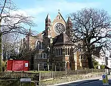 St Peter's Church is a Grade II* listed building[7] standing in a prominent position on the east side of Leigham Court Road immediately south of its junction with Glennie Road. The building takes full advantage of its position on rising ground facing a curve in the road. Much use is made of polychrome brickwork which, combined with clay tile roofing, turrets, varied fenestration, a stair-turret and a large wheel-window give the west frontage an asymmetrical but picturesque appearance. Taking advantage of the lie of the land, the ground floor of the west end of the building houses a set of parish rooms. The worship area occupies the upper part of the entire structure, being reached by a flight of steps and a ramp that lead to an entrance that opens on to the higher ground towards the east end of the site.[8]