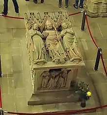 In 836, the bones of St Severus were transferred by the Archbishop of Mainz, Otger of Ravenna, first to Mainz, then to Erfurt. Here they had presumably been buried and venerated in the western part of a predecessor building of the church. When the church was rebuilt, it became necessary to redesign the tomb, which continued to be placed in a central position, presumably near the west choir. In the fire of 1472, the west choir was severely destroyed, after which the tomb was dismantled and the side slabs placed elsewhere. The original cover plate was used after 1472 as a top for the Severus altar in the south transept arm. It was not until 1948 that the parts were reassembled and erected at this location, and in 1982 a cast of the cover plate was added.
