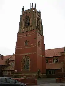 St Anne's-on-the-Sea was developed as a seaside resort in the 19th century, and its first church was St Anne's, completed in 1873. The parish of St Thomas dates from 1893 when a small mission church of wood and corrugated iron was built in Orchard Road. When it was clear that a larger and more permanent church was needed, a list was started for subscriptions. Land for the new church was provided by local landowner John Talbot Clifton and brewer Robert Slater Boddington gave £500.[1] Construction began in 1899 to a design by Lancaster-based firm Austin and Paley.[2] The architects had won the commission in a competition held in 1892, and the plans had been agreed by 1895. The planned tower, porch, and two bays of the nave were not built at this time. As then built, the church provided seating for 600 people.[3] The church was dedicated to St Thomas in 1900 by James Moorhouse, the Bishop of Manchester.[1] The tower, porch and extra bays for the nave were added in 1904–05, increasing the seating to 670.[4]