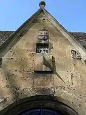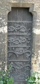 The chancel, which has a ceiling decorated by C. E. Kempe, has three windows in the style of the late 12th century,[7] and a priest's door built into the south side circa 1250.[1] A south porch was built in 1621 at the behest of Dr Robert Burton, whose arms are carved in the gable above the date.[8] A candelabrum given by Ann Kendall in 1705 hangs in the chancel. The chancel ceiling was decorated with a pattern of gold stars on a blue background in 1914. Two years later, an altar was erected at the east end of the north aisle, and an aumbry placed in the north wall of the chancel. The royal arms of William IV are displayed in the tower.[1]