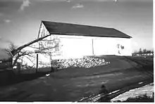 Northeast of the main house is a large bank barn. It has a gable roof with wood shingles. Siding is vertical wood planks. The foundation is field stone with a hand hewn beams. The trees used were cut on the farm. A threshing floor is on the top floor. On the ground floor are stables and milking stalls. On the west end of the barn, there is a shed roof addition which contains a corn crib and wagon shed.[2]