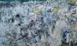 Like Picasso's painting Guernica, the painting addresses the horrors of war, in this case depicting the Battle of Stalingrad, one of the most notable events of the Second World War. Jorn's impression of warfare is conveyed above all in the process behind the painting. Indeed, his thick coating of colour is more of a process in its own right than a representation, revealing war as a phenomenon beyond man's understanding. Stalingrad could be seen as an enormous battlefield where all traces of mankind and civilisation were buried under layers of snow. An outline of a body or the suggestion of a face can perhaps be discerned but under the surface, the destruction and upheaval are already fading from memory. Jorn sees war as a tragedy of madness, completely devoid of heroism. Created at a time when mankind lived under the threat of nuclear war, the painting can be seen as the artist's personal expression of a world lamenting its own end.[1]