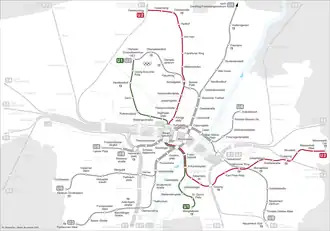 The operation on the Stammstrecke 2 is now used by the lines U1 and U2, as well as by the amplifier line U7. These lines operate parallelly in the part of the routes located in the city center.[1]