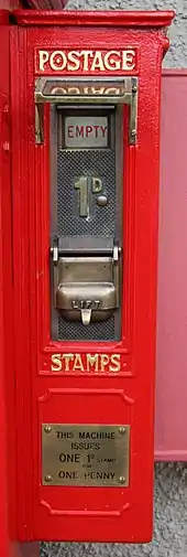 The K4 (or Kiosk No. 4) design of the classic British red telephone box, introduced in 1925, incorporated a stamp vending machine.[1] Five of the original fifty K4s remain standing today and was described as an "automated mini-Post Office".[2]