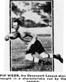 New Zealand departed for Sydney on 3 July on board the Moeraki.[22] Webb made 6 appearances on the tour with 5 at halfback and 1 against New South Wales late in the tour at centre. He played in the opening match of the tour against New South Wales on 11 July at the Sydney Cricket Ground. New Zealand lost before a crowd of 24,000 by 7 points to 4. Webb was playing alongside his Devonport clubmate Bert Laing who was captaining the side in the standoff position.[23] New Zealand were said to be the better side but wasted several scoring chances through poor handling. It was said surprisingly that Laing and Webb “had no understanding” with each other with Laing's handling being slow and bad. Webb “still has the old mode of putting the ball in the scrum, throwing downward. The recognised style here now… is for the ball to be slung in almost horizontally or delivered at least lower than the knee”.[24] Webb then played against the Australian Universities side at the Sydney Sports Ground before 2,500 spectators. New Zealand lost 15–13 with Webb scoring New Zealand's last try which failed to be converted by Craddock Dufty thus costing New Zealand a chance of a draw.[25] Earlier he had sent a smart pass to Maurice Wetherill who scored New Zealand's first try which was converted by Neil Mouat to give New Zealand a 5–0 lead.[26] Webb was replaced at halfback for the 3rd tour match against Newcastle by Wilson Hall with The New Zealand Herald reporting “Webb played a fine game at halfback against New South Wales, and it is hard to understand why Wilson-Hall is selected instead of him”.[27] Webb missed selection for 2 further matches against New South Wales before returning to the side for their 6th tour match against Far North Coast on 29 July. The match was played in Lismore before 5,000 spectators. New Zealand won 21–20.[28] He was said to be “smart at clearing the ball from the scrums”.[29] On 5 August he played against Ipswich on North Ipswich Reserve with New Zealand losing 22–21.[30] He helped set up a try for Frank Henry when he passed the ball to him ten yards out and he crossed for a try which Craddock Dufty converted to narrow the score to 14–13 to Ipswich. The Brisbane Courier reported that Webb “is a new player, who is very tricky and speedy” and that he was “the finest of the inside backs. He was always dangerous, and took slices out of the defence by pace and trickiness when he was given the slightest chance”.[31] Webb was not selected for the next 2 matches but was chosen to play centre against New South Wales on 15 August. New Zealand won the match 19–18 at the Sydney Cricket Ground before 16,000 spectators. In the first half Wetherill was playing behind the scrum but in the second Webb moved into the half back position. He scored New Zealand's final try after Mouatt passed to him during “loose play” and Webb “scored easily”.[32] The try was converted by Mouatt giving New Zealand a 19–13 lead which they hung on to.[33] In the final match of the tour Webb moved back into the half back position for New Zealand's 26–25 loss to the Southern Division at Fisher Park in Cootamundra. New Zealand had travelled 253 miles over night by train to reach the venue. New Zealand was on the wrong end of a 28-3 penalty count with several of the Southern Division's points coming from penalty shots at goal.[34] Webb crossed for a try in the second half after gathering the ball and “dummied several opponents, and scored near the posts”.[35] After the conversion New Zealand led 25 to 12.[36]