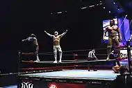 Below: Star Jr. (left) celebrating with Carístico and Ángel de Oro after their winning their match.