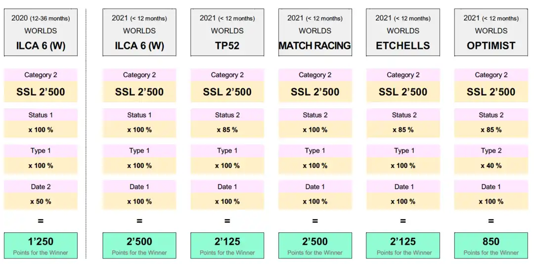 Status 1 OLYMPIC CLASS 100% Olympics + Particularities:  49er, 49erFX, ILCA 7, ILCA 6, Nacra 17 Mixed, 470 Mixed + Current America's Cup Class + Match Racing Grade W + Grand Prix I