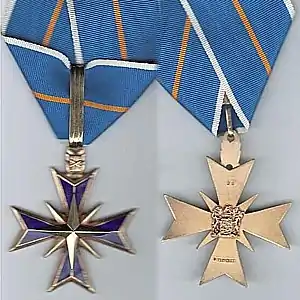 The decoration is worn around the neck on a dark blue ribbon, 35 millimetres wide, with white bands on the edges, each two millimetres wide, and a two millimetres wide orange band in the centre.[1]