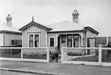 An archetypal 1930s and 1940s state house is a detached two- or three-bedroom cottage-style house, with weatherboard or brick veneer cladding, a steep hipped tile roof, and multi-paned timber casement windows.[3] Thousands of these houses were built across New Zealand as state housing, and as private housing after World War II, when the government started selling their drawings and plans in an attempt to hasten housing construction.[4][5] These houses, also known as "ex-state houses" to distinguish them from modern state housing, have a reputation of being well-built and are very sought after by real estate buyers, especially after the leaky homes crisis of the 1990s and 2000s hit buyer confidence in newer stock.[6]