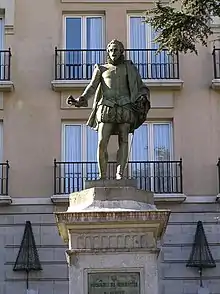 The bronze statue by Solá was cast in Rome and arrived to Madrid in 1835.[1] It features the standing figure of the writer with a slightly bent right leg, holding a roll of papers with his right hand and leaning the left one on the knob of his sword; he wears Spanish breeches, a buttoned-up jacket, ruff and a short cape.[2]