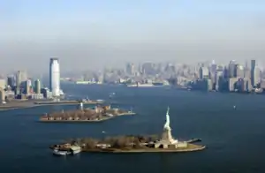 The Statue of Liberty is a world-famous symbol of freedom, given in 1886 by France to the United States in celebration of American Independence. Nearby Ellis Island was the first stop for millions of immigrants to the U.S. in the late 19th and early 20th centuries.[20] The national monument recalls this period of massive immigration to the United States.[21]