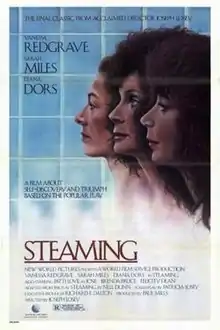 Steaming is a British drama film directed by Joseph Losey, released in 1985, the year after his death. The last film that Losey directed, it was adapted by Nell Dunn and Patricia Losey from Dunn's play of the same name. The film was screened out of competition at the 1985 Cannes Film Festival.[3] The story is about the women who meet regularly in a Turkish bath and decide to fight its closure. The cast was headed by Vanessa Redgrave, Sarah Miles and Diana Dors. It was the last film appearance by Dors, who died in 1984.[4]