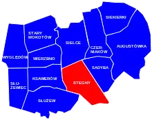 Stegny is a neighborhood in Mokotów district of Warsaw, Poland. It is primarily residential, with several small retail centers and "convenience" shops including small grocery stores, butchers shops, bakeries, and the like. Stegny is characterized by its many concrete high-rise apartment buildings, constructed during the 1970s under Communist rule. These buildings are so alike in appearance that they have been painted various colors to allow local residents to tell them apart. Additionally, there are several apartment blocks of only five stories and many newer single-family townhouses that have been built since the 1990s.
