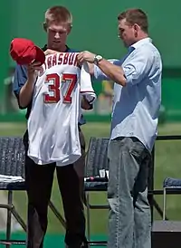 Stephen James Strasburg (/ˈstrɑːsbɜːrɡ/;[1][2] born July 20, 1988) is an American professional baseball pitcher for the Washington Nationals of Major League Baseball (MLB). Strasburg was selected by Washington with the first overall pick in the 2009 Major League Baseball draft. He made his major league debut in 2010 and is a three-time All-Star.