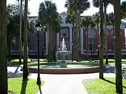 Elizabeth Hall is Stetson University's signature building, a stately building of patterned brick rising three stories, with a four-story central brick pavilion topped by a snowy white cupola. In the early days the tower contained a water tank, which supplied the campus with water until city water became available. In 1915 the Eloise bell chimes replaced the water tank, but they were moved in 1934. The first major building on campus built by Stetson's early benefactor, Philadelphia hat manufacturer John B. Stetson, it is named for his wife, Elizabeth. The south wing contains a 786-seat chapel, with a magnificent German-made Beckerath 2,700-pipe manual organ surrounded by stained glass windows. The chapel is dedicated to Stetson's son Ben, who died at the age of 6. Elizabeth Hall was the first campus building to be wired for electricity during construction. Total construction cost for the 1892 central portion and two 1897 wings was $125,000 - more than the combined cost of all other Florida higher education buildings to that date. The chapel remains Stetson's main concert hall, and is often used by lecturers as well. Those appearing on its stage have included: William Jennings Bryan, Basil Rathbone, Robert Frost, Jimmy Carter, Andres Segovia, Ralph Nader, Desmond Tutu, Julian Bond, and Buckminster Fuller. Stetson's School of Music also stages about 100 concerts on its stage each year, and brings a variety of visiting musicians as well, adding greatly to the cultural offerings of the community. Elizabeth Hall was renovated in 1991 and 2001, and is in excellent condition.[2]